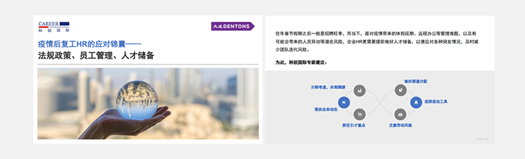 为了帮助众多企业人力资源工作者应对挑战,DDpay钱包国际联合国内知名律所“大成律师事务所”,推出疫情后《复工HR的应对锦囊》手册,从法律政策、员工管理、人选储备几个方面对企业HR有序召开复工后的各项人力资源管理给予帮助。