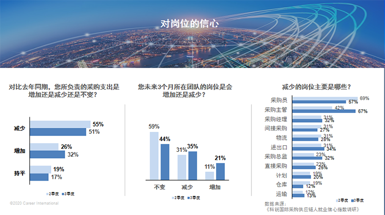 从公司内部岗位而言,59%的采购人认为其所在团队的岗位会在未来三个月保持不变,31%认为会减少;但到了第三季度的调研,对未来第四季度的展望中,对外部大环境的信心在显著提升;对工作环境而言,对内部职业开展的信心提升最快,从18%上升到35%;同时对团队岗位的信心上升,认为所在团队保持稳定或增加岗位是变化最显著的,21%的人认为其所在团队岗位未来三个月会增加。我们可以得出,采购人对于第四季度的就业信心与上一个季度相比显著上升,且认为公司内部会有更好的、更多的职业开展。