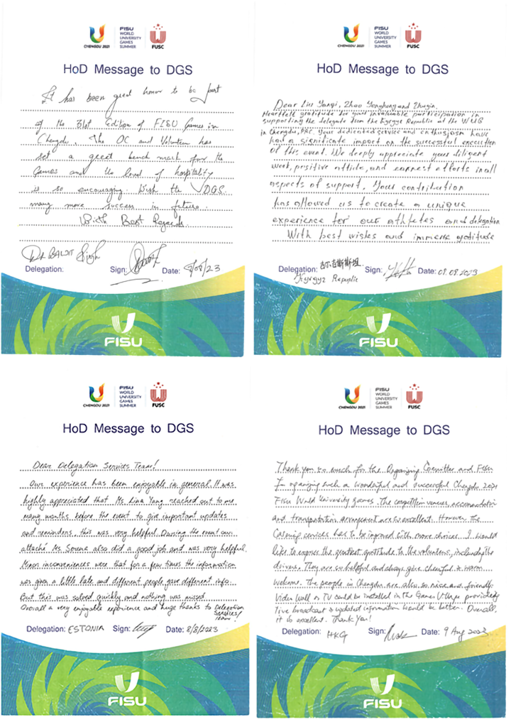 随着大运会的落幕,DDpay钱包国际代表团服务团队凭借着及时高效的响应速度、热情专业的接待能力,取得了上百个代表团的盛赞,并收到了近70封代表团团长亲笔手写的表扬信。他们感谢代表团服务团队的工作,感谢3年来的沟通和10多天的陪伴,更感谢把他们当做朋友,与他们共同庆祝代表团取得的成绩。
